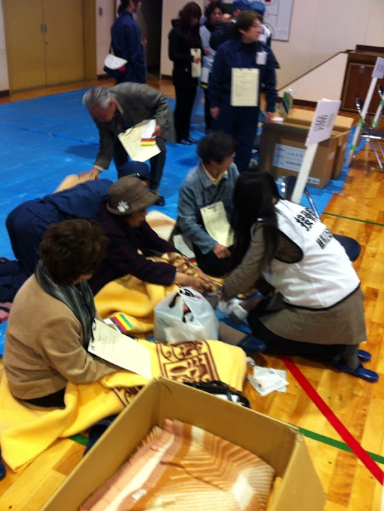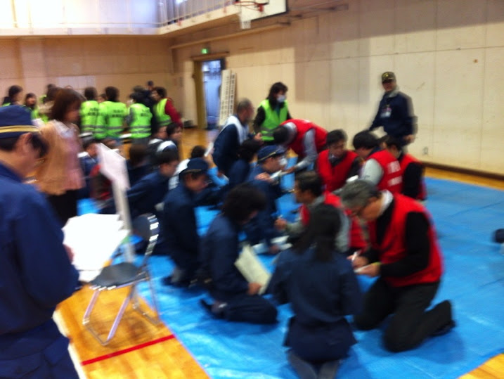 | 「トリアージ緑」の応急処置 トリアージグリーンの患者は柔道接骨師によりこのように応急手当を受けています。 骨折患者もここで添木やバンデージ等で固定処置を受けることも可能です。 |